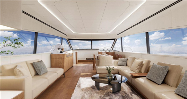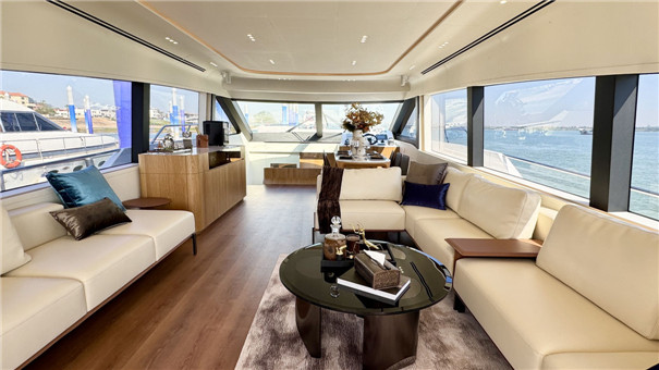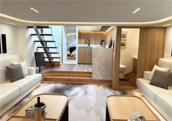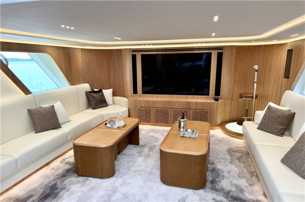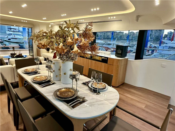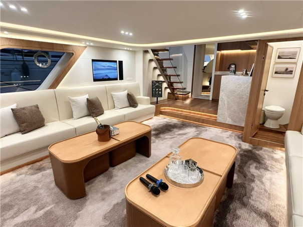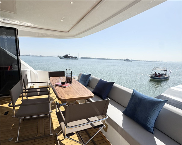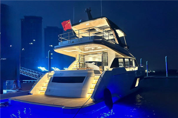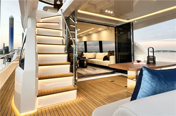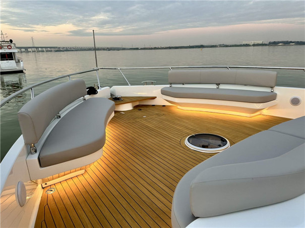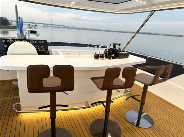 此艘游艇为2026年全新游艇,由意大利名师设计,优雅的流线,细节做工满满的质感,水底灯让夜晚氛拉满。厨房、洗手间、淋浴间一应俱全,宽大的尾甲板以及中间层客厅,宽敞的餐厅和折叠门让空间更通透,底层还有超大KTV包房:顶层还有360°观景的顶层飞桥。