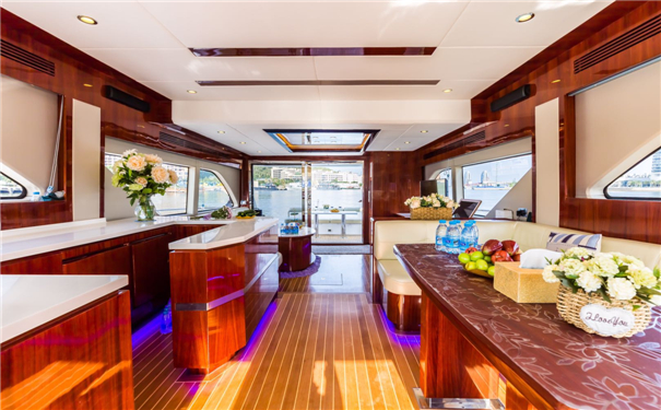 大面积的船艏阳光浴台、跳水平台、社交空间,将激情迅速从心底升腾而出;露天吧台和U型沙发区域,极尽各类娱乐享受。主甲板不仅提供了更大面积的沙龙区域,底舱中部阔绰的空间配备有豪华电视、环绕音响系统及KTV娱乐设备;如有会议或是商务需求,这一空间摇身一变即是一个隐秘的海上高端洽谈区。